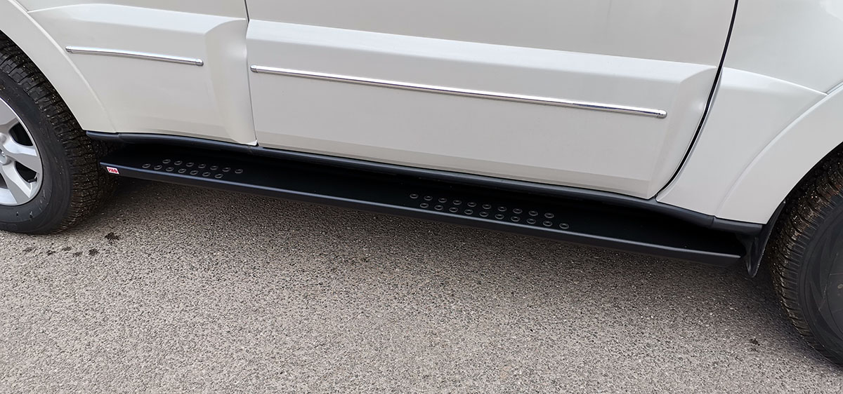 Toyota Land Cruiser 76. Сталь 3 мм. Черное порошковое покрытие. Рифлёная алюминиевая площадка. Устанавливаются в штатные места. Крепится за раму. Выдерживает подъем домкратом.
