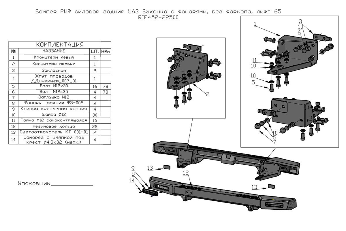 Бампер РИФ силовой задний УАЗ Буханка с фонарями, возможностью установки фаркопа, лифт 65 мм