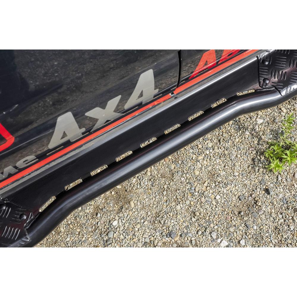 Видимая часть силовых порогов РИФ для Toyota Hilux выполнена из стальной трубы (толщина стенки 2,5 мм, диаметр — 51 мм), сверху — накладка из рифленого алюминия. Пороги не портят внешний вид автомобиля, органично вписываясь в экстерьер, благодаря продуманному дизайну.