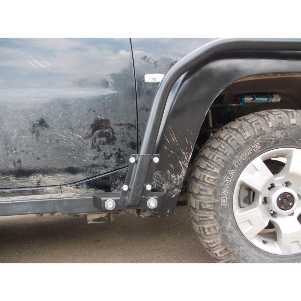 Для тех, кому требуется облегчить вес автомобиля, мы начали выпускать алюминиевые защиты крыльев. Алюминиевая защита крыльев изготовлена из алюминиевой трубы, обхваты и крепеж из нержавеющей стали, покрашена в черный цвет.